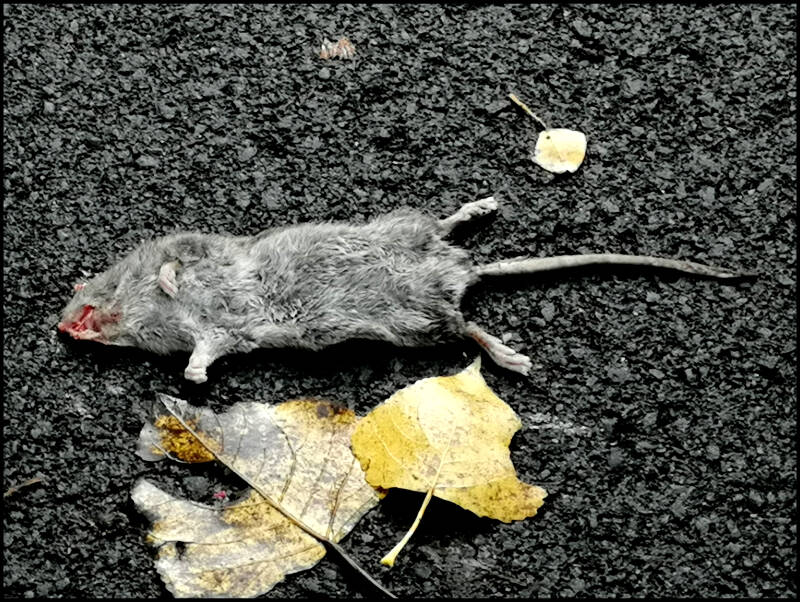 Toen ik deze dode rad op de heenweek toevallig signaleerde, dacht ik gelijk aan de gewoonte van mijn vriend Henk. Henk heeft voor dit soort gevallen altijd een plastic zakje bij zich. Hij vind het beeld en de gedachte dat een dood dier daar midden op de weg zou blijven liggen zo naar, dat kan ik me ook heel goed voorstellen. En ik weet dat Henk zeer regelmatig fietst en dan dus ook werkelijk honderden kadavers van de weg moet hebben weg gehaald. Ik heb hier zeker waardering voor, maar ben er zelf nog niet toe gekomen. Het beeld van deze dode.rat laat me wel verschillende beelden bij me achter. Hoe is deze arme rat om het leven gekomen? Wat zullen andere voorbijgangers uitroepen? En ja, natuurlijk het beeld van mijn vriend Henk. Daarom besloot ik deze 3 beelden toch maar even vast te leggen.